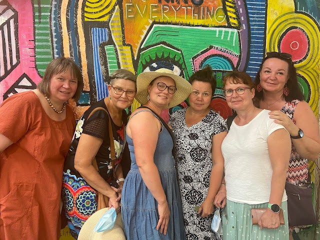 Eikä siinä kulunut kuin muutama päivä, kun olimme kolmistaan koolla Kuusan torilla kahvilla. Ai että, miten mielenkiintoinen keskustelutuokio meillä oli. Bonuksena on se, että puhekielemme on toistaiseksi pääasiassa englanti, samalla Rahma oppii pikkuhiljaa suomea. Nykyään käymme yhdessä jumpissa, kävelyllä ja kahvilla. Ja keskustelemme paljon myös WhatsApp-ryhmässämme. En olisi etukäteen uskonut, että jonain kauniina päivänä minä opettaisin englanniksi mustikkapiirakan leipomista – en nimittäin ole kovinkaan kokenut leipoja. Ainakin meillä oli Rahman kanssa hauskaa ja piirakkakin paistui sopivaksi.